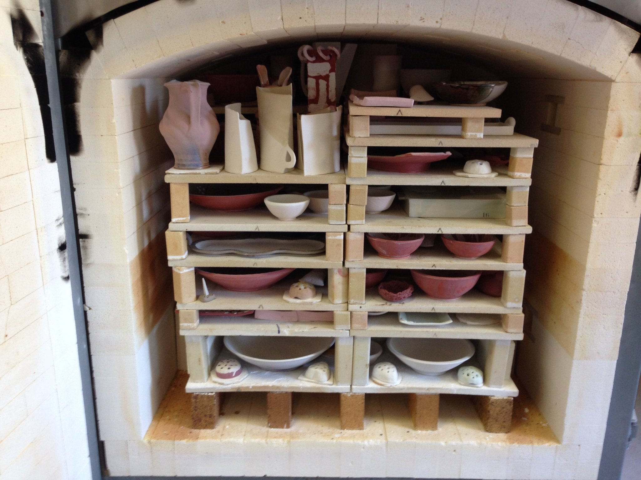 Potluck 2025- Vendela, Brenda, Caroline, Kelly, Melissa and Serena, showing off the pottery dishes that they brough to eat from!
